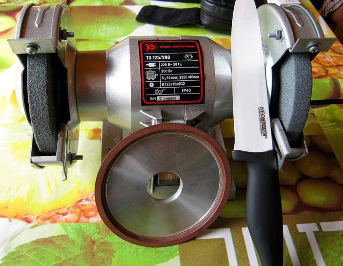 Goedkope keukenslijpers zijn niet geschikt voor keramiek. Gebruik ze een paar keer - en gooi het mes gerust weg. Voor zo'n delicaat werk moet je op zoek naar een product met een diamantcoating.
