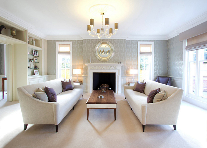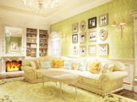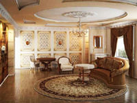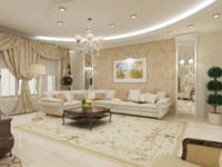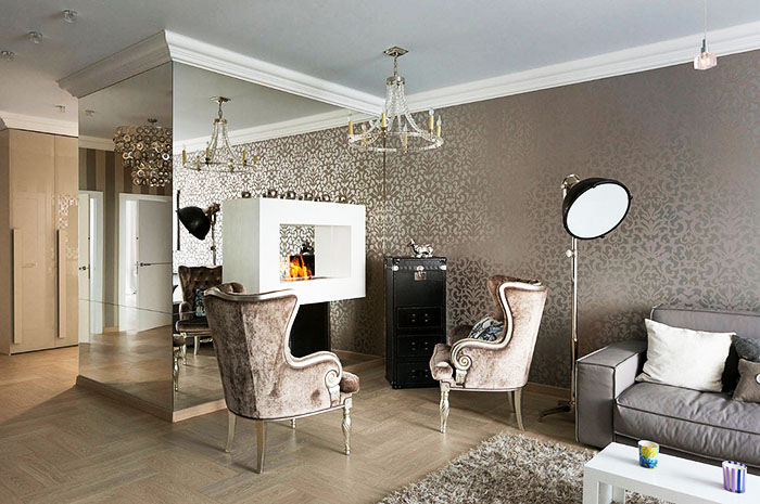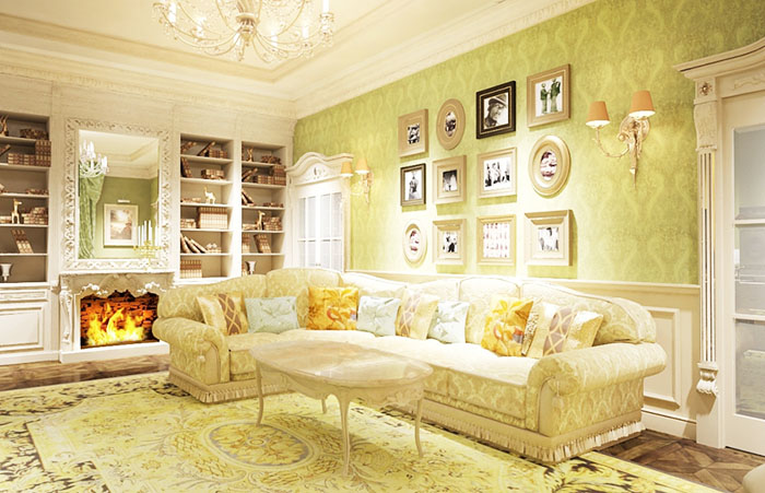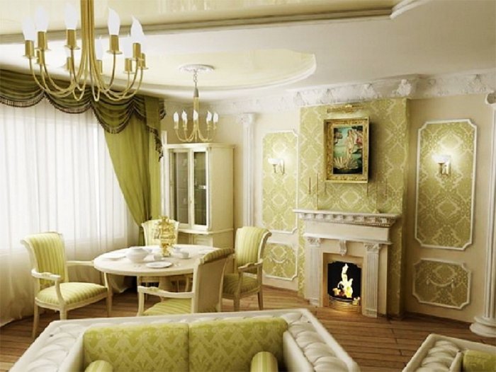 Малко апартаменти могат да се похвалят с хол с достатъчна площ за камина, мебели и други интериорни предмети в класически стил. В този случай акцентът в декора е върху тапета. Като правило класиката в довършителните материали се характеризира с доста богата цветова гама и "традиционни" модели: