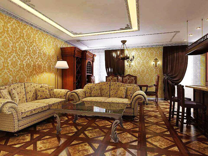 Тапетът за зала, направен в класически стил, трябва да има скъп и представителен външен вид: