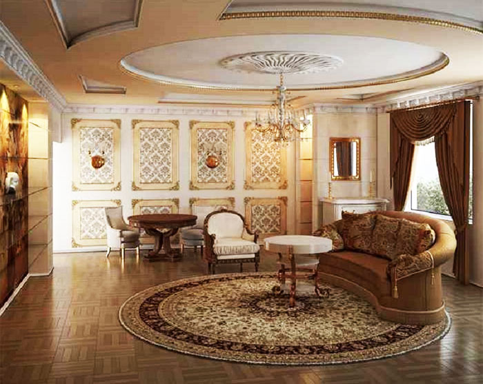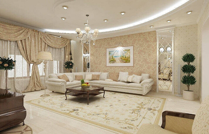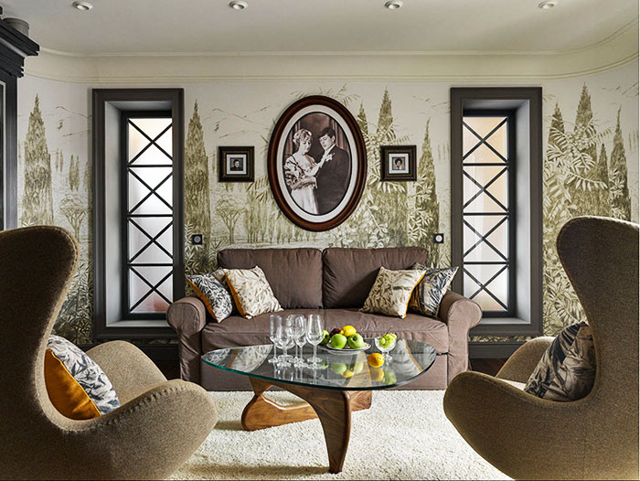 Тапетът за хола е направен в стар стил, подчертавайки лукса и богатството на декорацията: