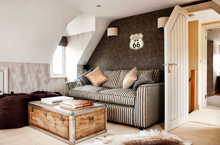 Стилът на таванското помещение се характеризира с комбинация от модерни мебели и атмосферата на стара къща: отворена тухлена зидария, грубо измазани стени, недовършени греди на тавана. Същите текстури могат да бъдат проследени в тапета, те имитират естествени материали, мазилка, камък или тухла. Въпреки това, в някои дизайнерски решения тапетът може да се използва като ярък акцент.