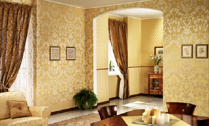Изработват се чрез фиксиране на естествена материя върху нетъкана или целулозна основа. На пазара на довършителни материали можете да си купите текстилни тапети с текстури от юта, велур или филц. Този завършек е идеален за декорация зала в класически стил... Той добавя изтънченост и изтънченост към интериора на стаята.