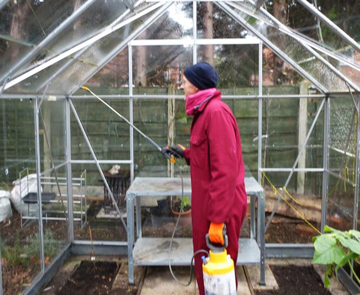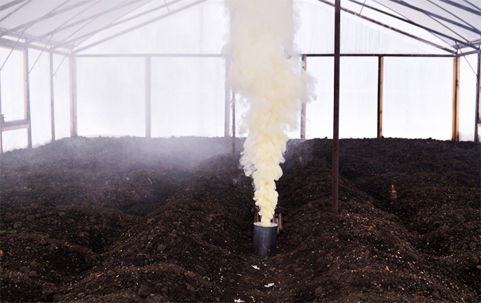 Ако оранжерията не е върху метална рамка, тогава стаята трябва да се опуши със сяра. Веществото трябва да се смеси с керосин и да се разнесе по централната линия на сградата върху железни листове. От страната на изхода влакът се запалва и тръгва, затваряйки вратата след тях. Резултатът се очаква в продължение на 5 дни, без да се отварят нито вратата, нито вентилационните отвори.