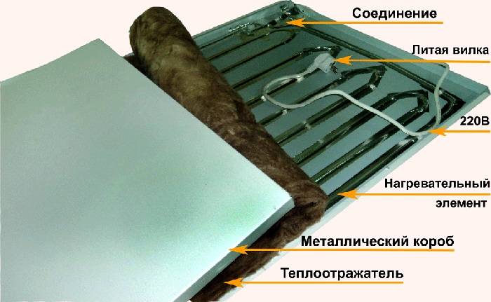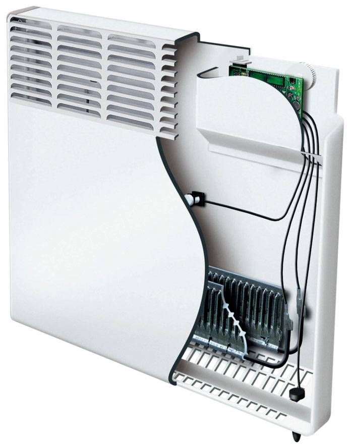 Основният елемент на дизайна е нагревателният елемент, който преобразува електричеството в топлинна енергия. Принципът на действие е въздушната конвекция. В този случай охладените потоци проникват в прорезите на долната част на корпуса и след това излизат през горните отвори. Конвекторът може да работи отделно или в система, контролирана от температурен контролер.