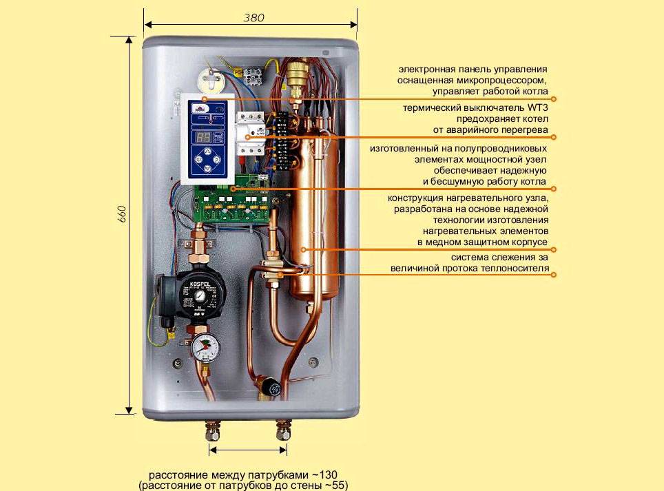 - в електродния тип на котела вместо нагревателния елемент има електрод, който действа върху свободните йони, което създава топлина. Това е безопасна опция за дизайн, тъй като устройството спира да работи, ако тече вода. При този метод на нагряване не се получава варовик, но като вода може да се използва само вода;