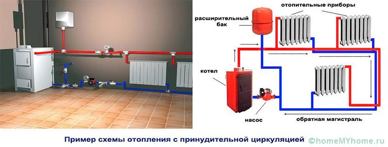 - С принудителна циркулация. За разлика от предишния случай, в тази ситуация циркулационната помпа е свързана. Неговата задача е да осигури достатъчна скорост на циркулация на охлаждащата течност за отопление на къщи с големи площи (повече от 100 m2) или сгради с повече от два етажа.