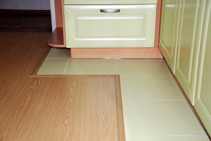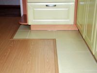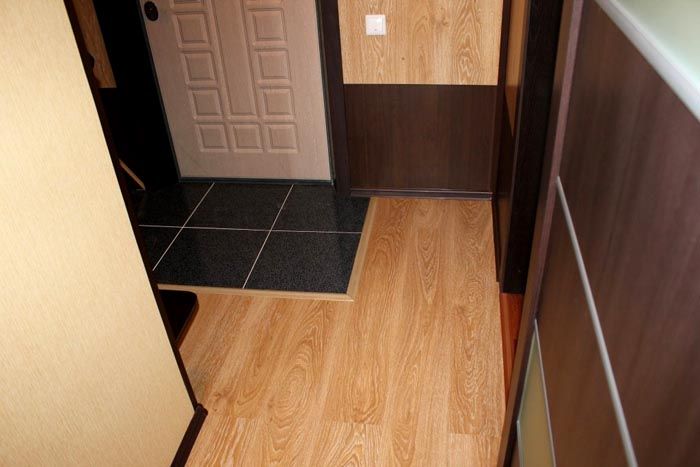 Чрез комбинирането на покрития можете да решите няколко проблема наведнъж. Поставете плочки на пода в коридора само в зоната предна врата, за кухнята е по-практично да се подчертае работната зона. Това визуално ще раздели района на зони. Красива комбинация може да се направи с ламиниран паркет, и със линолеум... В резултат на това получавате ефектно покритие на входната зона.