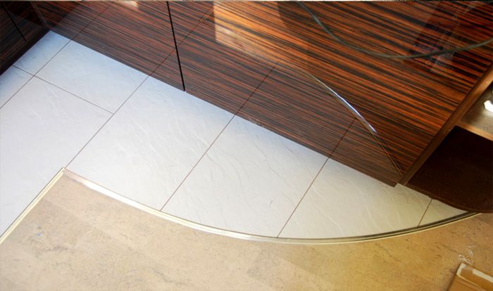 Като правило цветът се избира от различен цвят от второто покритие. Подравняването може да се извърши по права линия, извита, под формата на ъгъл. Освен това площта на плочките може да бъде разположена на определена кота под формата на малък подиум.