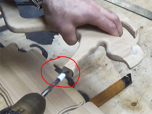 - След това в горната част на детайла изрежете с длето или на машина няколко отвора, които съответстват на формата на острието на ножа. Направете толкова ниши, колкото искате, за да съхранявате инструменти.