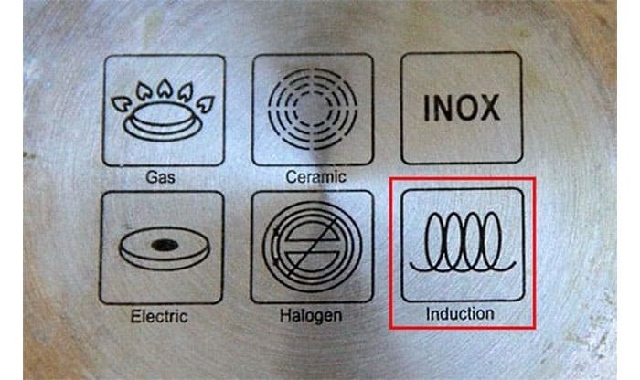 - Най-простият вариант: обърнете контейнера и потърсете маркировката. Икона под формата на завъртания на спирала или надпис Induction информира за професионалната годност на тази посуда.