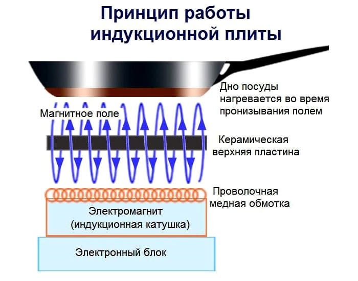 IN конвенционална печка всички елементи се нагряват и при индукция само дъното на съдовете за готвене ще бъде горещо. Цялата същност на работата се състои в образуването на магнитно поле на повърхността на устройството, създадено от вихрови токове, съгласно принципа на индукцията. Тоест, ако дъното на съдовете няма феромагнитни свойства, тогава няма да има нагряване.