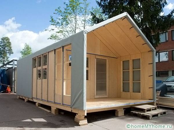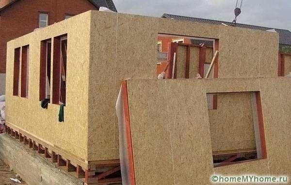 По време на строителните работи има два начина: да направите къщата сами или да наемете специалисти. Кутията е направена от готови панели, които се произвеждат в завода като сандвич панели. В този случай топлоизолационните материали се полагат между двата слоя и пароизолация... За сглобяване на конструкцията са необходими повдигащи съоръжения и подготвена основа.