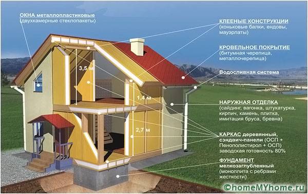 Рамковите къщи от тип сандвич са изградени предимно от дърво. Те се затоплят бързо, което спомага за намаляване на разходите за отопление. Имайки предвид проектите на рамкови къщи, както и техните снимки и цени, можете да изберете удобно жилище за вашите нужди. Класическите опции включват едноетажни сгради с двускатен покрив или двуетажна. Обмисля се интересно решение проекти с таванско помещение, балкон, веранда, както и вариант със счупен покрив.