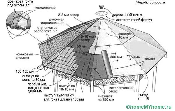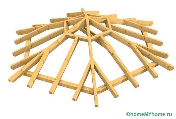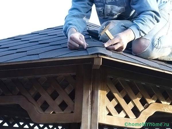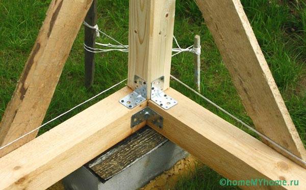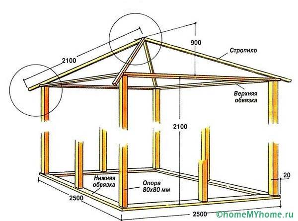 Agora equipamos o telhado do mirante. Se quiser fazer um telhado com inclinação oblíqua, instale 8 caibros nos postes de apoio, conecte-os com uma travessa horizontal. Como resultado, você obtém um design na forma da letra "A". Se você preferir pent passo a passo um gazebo de madeira com as nossas próprias mãos, depois equipamos uma viga maciça sobre os pilares.