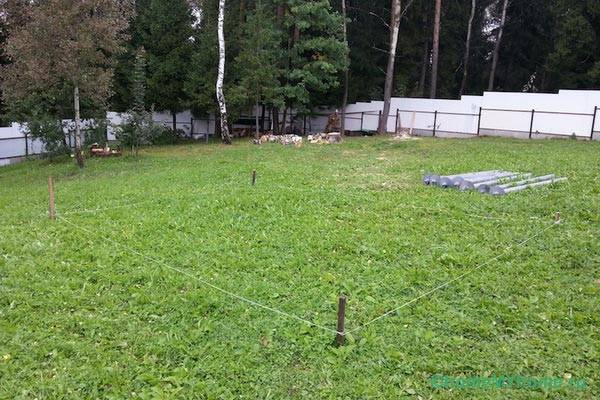 O terreno escolhido para a construção é limpo, e estacas de ferro são instaladas nos cantos de acordo com as dimensões acima. A linha de pesca é puxada nos cantos. Marque o local onde ficará a entrada.