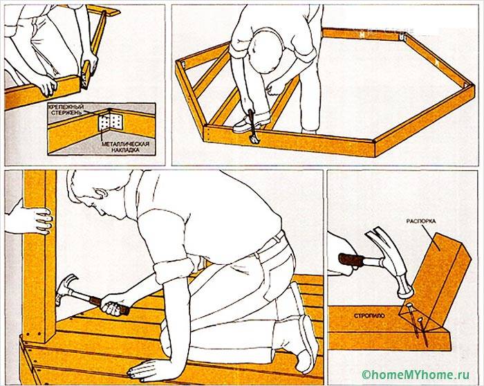 Além disso, ao longo das bordas do mirante (exceto para o local onde é planejada a entrada da estrutura), instalamos uma cinta de barra de madeira, em forma de padrão. Fixamos as barras com pregos e parafusos. Deixe a entrada do local aberta.