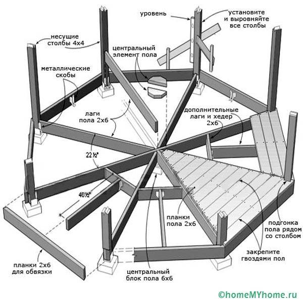 Abaixo está uma planta para a construção de um caramanchão octogonal de madeira. Este projeto é muito prático porque será confortável e conveniente dentro do gazebo: pode acomodar facilmente até 12 pessoas. Sua área pode ser diferente dependendo da localização e de seus desejos. A altura do caramanchão é de 2,5 metros.