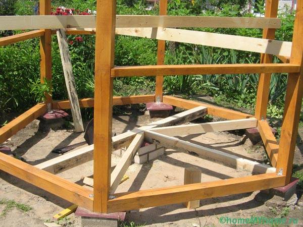 Antes de iniciar a construção, você precisa decidir qual gazebo deseja. Aqui, o vôo da imaginação é ilimitado. As estruturas podem ser retangulares, hexagonais, redondas, quadradas, etc. Tendo decidido a forma, você precisa definir as dimensões do futuro edifício.