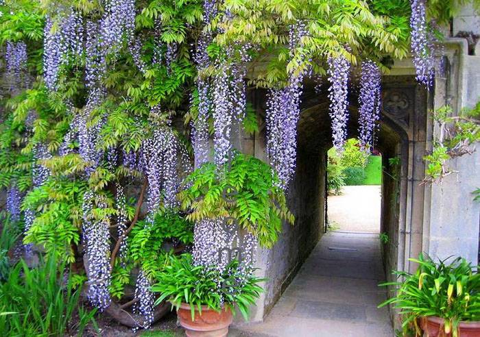 Wisteria é uma planta semelhante a uma árvore, ou melhor, uma liana com cachos de flores roxas, vermelhas e brancas. Existem também variedades que são resistentes à geada, mas em invernos muito frios, essas plantas congelam. Os brotos de glicínias podem cobrir estruturas altas, como cercas ou paredes. A cultura floresce de maio a julho, e com os devidos cuidados em setembro. A variedade chinesa inclui várias variedades. A maioria das plantas são lilases roxas, mas também existem variedades com flores duplas brancas.