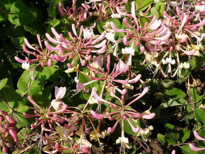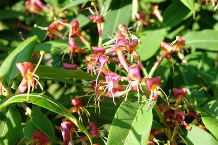 - madressilva Henry cresce até 2,5 metros. Ele floresce com flores rosa brilhante e marrom-avermelhadas. A planta tolera bem a sombra;