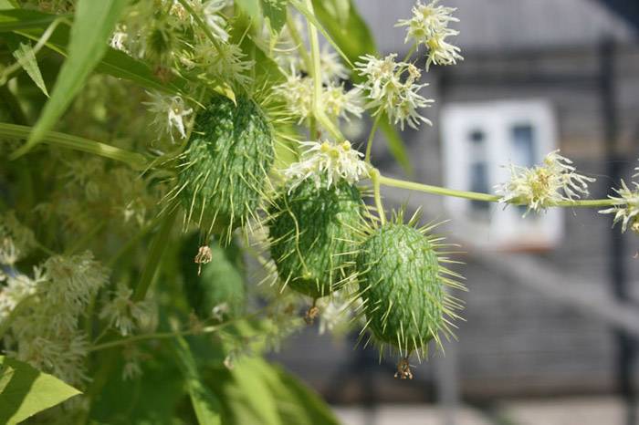As pessoas chamam de pepino louco. É bastante comum em nosso país e até é cultivado em regiões frias. Liana tem caules que atingem um comprimento de 6 a 10 metros. Solos não ácidos, permeáveis à umidade e leves são adequados para echinocystis. Em tempo seco, a rega é necessária, 4-5 litros por arbusto. Adapta-se perfeitamente a condições específicas de cultivo. Esta planta também é medicinal. É utilizado na medicina popular devido às suas fortes propriedades diuréticas, laxantes e anti-helmínticas. Mas ao mesmo tempo, é preciso saber as proporções de aplicação, já que a planta é considerada tóxica.