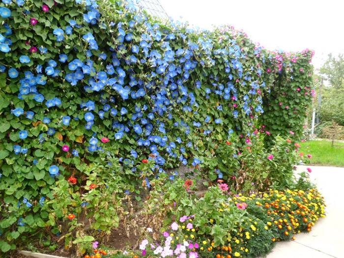 As colheitas anuais vivem apenas uma estação, durante a qual crescem folhagens e se espalham por toda a cerca. Mas com o início da geada, eles morrem. Existem alguns anuários que requerem manutenção mínima e podem até tolerar pequenas geadas. São feijões ornamentais e ervilhas-de-cheiro.Inicialmente, os brotos jovens devem ser amarrados até que se fixem nas cercas. Uma rede é ideal.