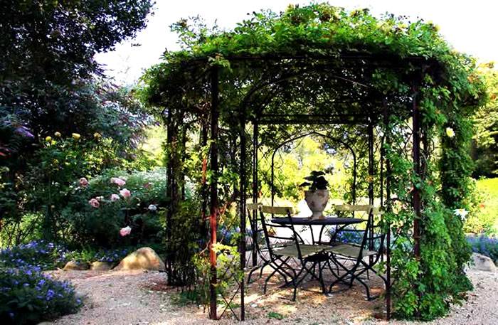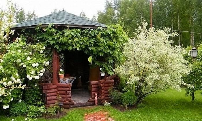 Todas as plantas que consideramos são adequadas não apenas para uma variedade de plantas, mas também para decorar gazebos. Se você plantar uma muda crespa com uma estrutura, ela pode crescer e gradualmente aderir aos elementos do edifício.
