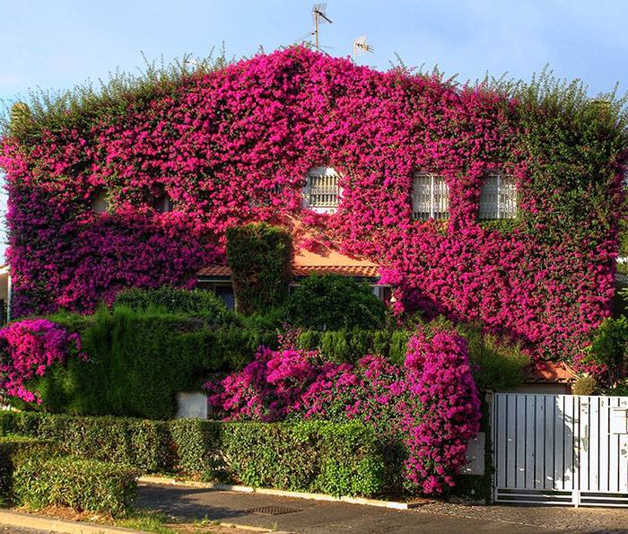 Bougainvillea é uma videira, arbusto e árvore. Não as flores em si são decorativas, mas seus canteiros. Eles podem ter vários formatos, bem como uma paleta de cores: do lilás ao branco. As variedades mais populares são as peruanas, peladas e finas. Esta cultura é adequada para cultivo nas regiões do sul. E em outras áreas, ele só pode ser cultivado em vasos e levado para o jardim em dias quentes. Tubos também podem ser colocados perto de cercas, mas com o início de uma onda de frio, a planta deve ser removida para um quarto aquecido.