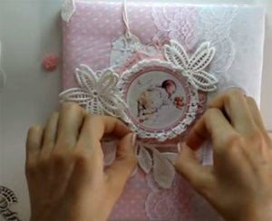 O design elegante é adequado para diversos álbuns temáticos. A base é feita por envelhecimento artificial, craquelure nas páginas. Os elementos obrigatórios serão rendas, tingimento acrílico branco, abrasões.