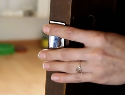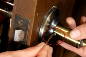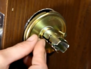 - Abra a porta e gire a maçaneta de forma que através de um pequeno orifício você possa ver o botão interno no corpo da maçaneta.