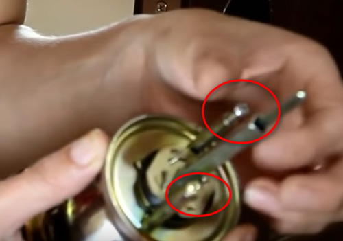 Se a maçaneta se recusar a retornar, o mau funcionamento pode ser devido ao mau funcionamento da mola de retorno da maçaneta. Para verificar isso, você precisa desmontar as conexões. Para fazer isso, remova o núcleo do soquete e remova a mola de dentro.