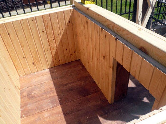 As paredes laterais são feitas à mão da mesma forma que as traseiras e frontais. Dentro da casinha colocam isolamento, barreira de vapor e cobrem tudo com ripas ou ripas, como na foto