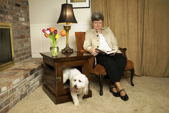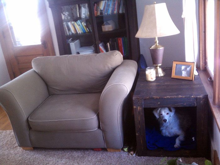 Para raças grandes, é mais fácil pegar qualquer cômoda velha e restaurá-la no interior do quarto colocando uma cama dentro da casa improvisada.