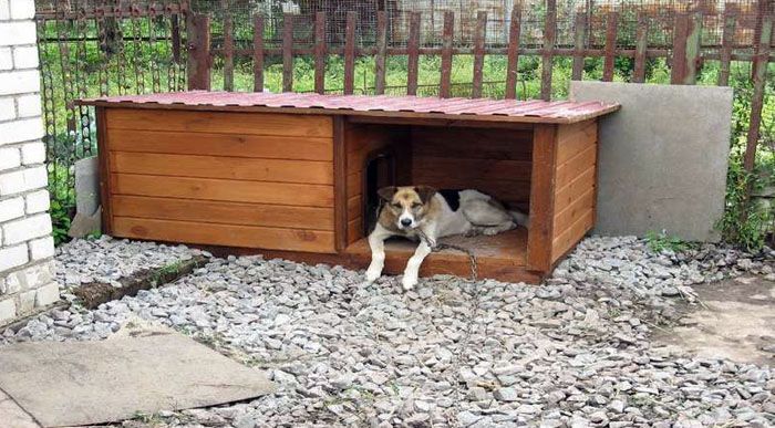 Se o cão for sentar em uma corrente, existe a opção de instalar um longo fio de aço para maior liberdade do animal. A corrente deslizará sobre o fio e o cão poderá percorrer todo o comprimento da corrente e retornar ao canil. Você pode concretar o local - mas lembre-se de que os cães adoram cavar buracos e esconder ossos lá. Portanto, se você quiser deixar essa oportunidade para o seu animal de estimação, vale a pena concretar o espaço ao redor do estande, caso contrário o cão pode cavar na fundação, e na primavera irá enxá-lo com jatos de água.