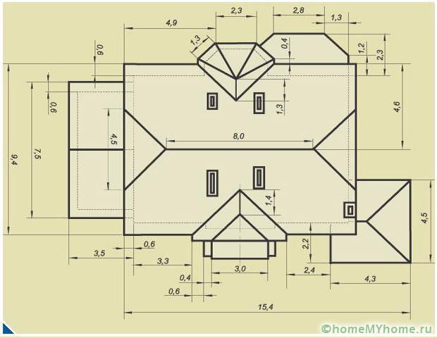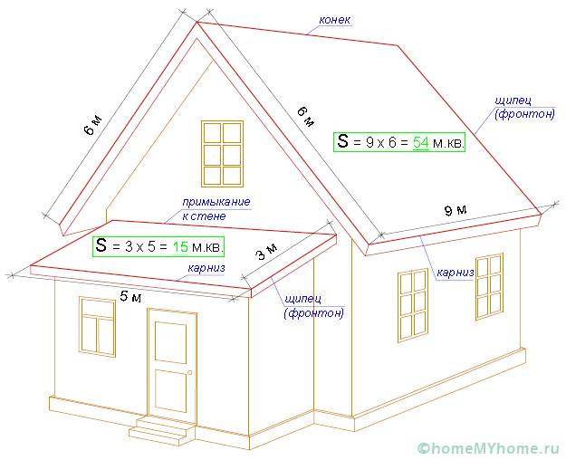 Com uma configuração complexa da estrutura do telhado, os cálculos são realizados de forma diferente. Toda a superfície do telhado é dividida em partes separadas. A área de cada elemento é calculada e, em seguida, os valores resultantes são somados. Em seguida, os coeficientes são usados para o valor obtido.