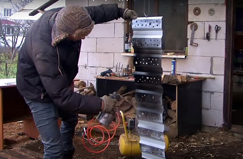 As luminárias e abajures de piso são uma opção conveniente, especialmente se você prefere ler em uma poltrona. O principal neste projeto é uma perna alta e um abajur confortável. E tudo isso pode ser feito com quase qualquer material disponível, até mesmo restos de madeira e folhas perfiladas. Como este exemplo:
