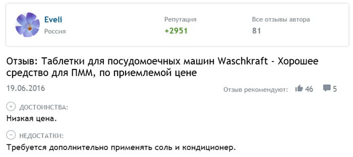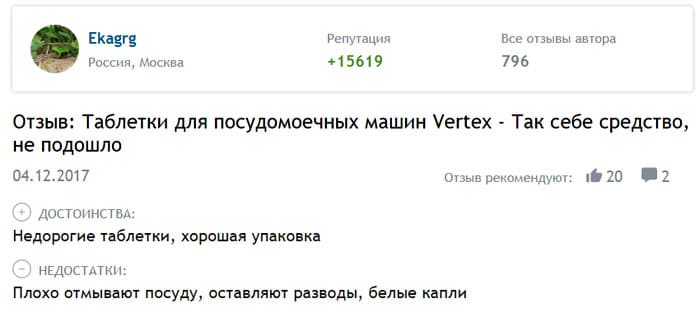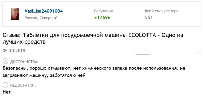 O produto italiano é baseado em matérias-primas ecológicas. Na verdade, funciona bem mesmo com gordura congelada. Os corantes que ficaram na louça também são bem lavados. O pacote contém 32 comprimidos a um preço de cerca de 500 rublos por pacote.