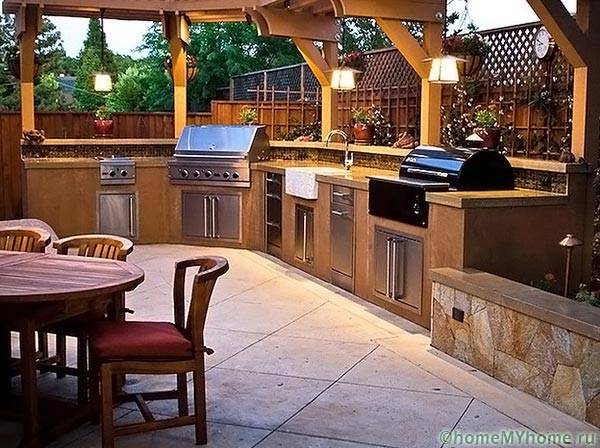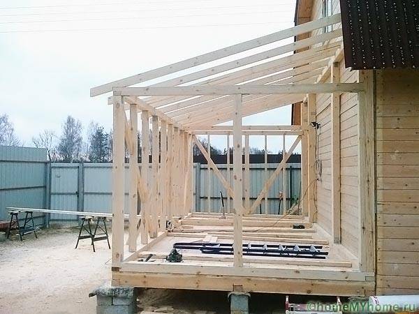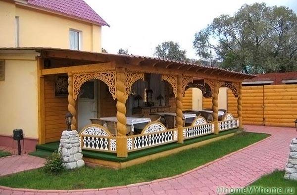 - uma varanda aberta é uma opção econômica para reuniões noturnas, a parede adjacente à casa de campo está envolvida;