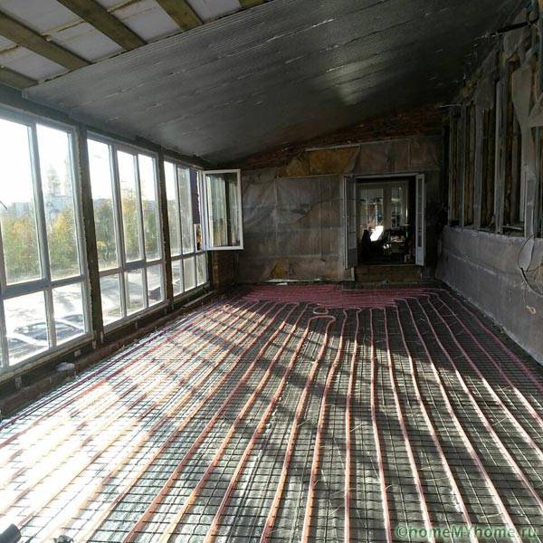 Piso aquecido sob o laminado em piso de madeira. Em uma publicação separada, você pode descobrir como os pisos quentes são montados em uma base de madeira e todas as nuances da instalação.