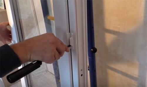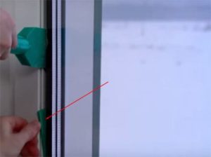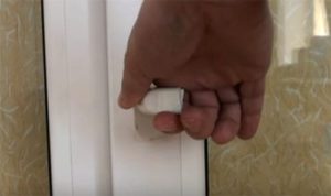 - Придържайки подвижното крило с ръка, леко натиснете блокиращата лента. По това време дръжката трябва да се завърти в режим на отваряне успоредно на перваза на прозореца.