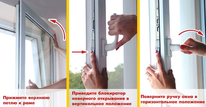 Това може да се случи, когато потребителят започне да завърта дръжката, докато прозорецът е отворен, съответно блокиращият механизъм се задейства. Алгоритъмът на действия е следният.