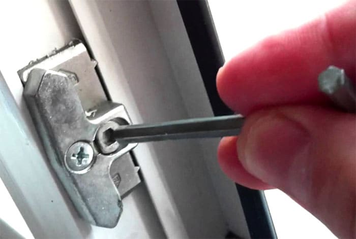 За да регулирате долната част на подвижното PVC крило, трябва да изпълните следните стъпки с долния шарнир.