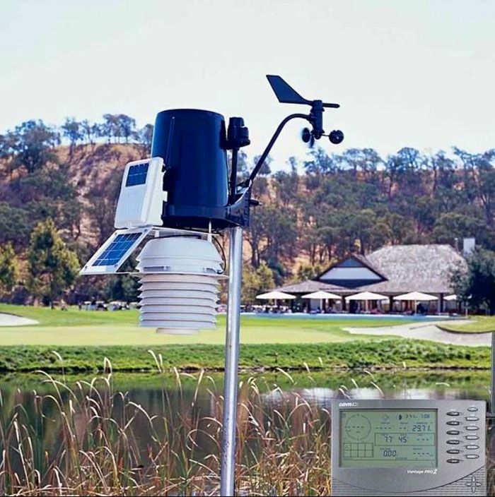 În acest exemplu, senzorii pentru temperatură, umiditate, presiune atmosferică, direcția vântului și viteza sunt montați pe un stâlp metalic robust. Semnalele de la acestea sunt trimise către unitatea interioară prin canale de comunicații fără fir. Este instalată o baterie solară pentru alimentarea autonomă a componentelor externe ale kitului.