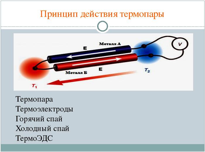 Cu ajutorul acestei figuri, vom înțelege modul în care funcționează senzorul de temperatură. Produsele de acest tip sunt fabricate din fier și constantan, crom și aluminiu și alte două metale diferite („A” și „B”). Este de dorit să se mențină o temperatură constantă în zona "T2". Când se schimbă pe secțiunea "T1", o forță electromotivă este generată în conductori în funcție de efectul fizic Seebeck. Tensiunea generată poate fi măsurată cu un voltmetru sensibil „V”.
