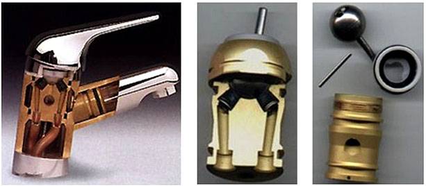 - Dispozitiv tip minge. Partea principală și caracteristica acestei categorii este o bilă metalică situată în corpul supapei și având mai multe găuri. Primul servește la separarea apei reci, al doilea la cald și în al treilea compartiment se amestecă tipurile de apă anterioare, creând astfel un debit mixt. Recipientul prezentat în interiorul bilei metalice se numește „camera de amestecare”. Scaunele sunt garnituri de cauciuc care lucrează îndeaproape cu mingea interioară.