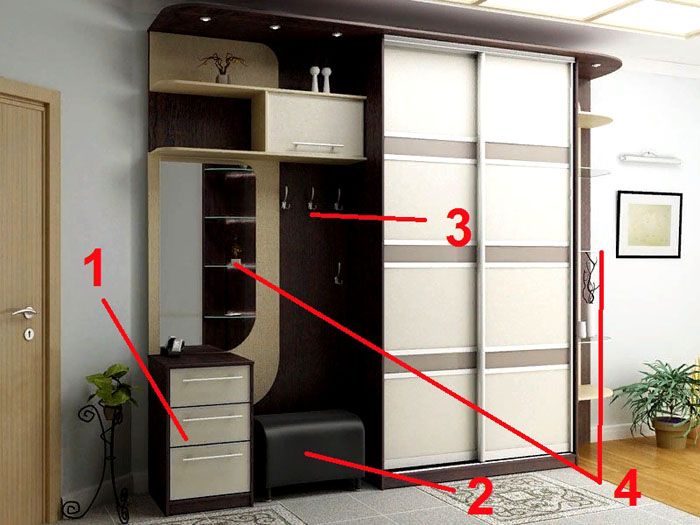 În apropierea holului de la intrare, acesta trebuie completat cu un suport pentru pantofi (1), o bancă confortabilă (2), umerase (3) pentru îmbrăcăminte exterioară, rafturi deschise (4) pentru accesorii și elemente de decor.