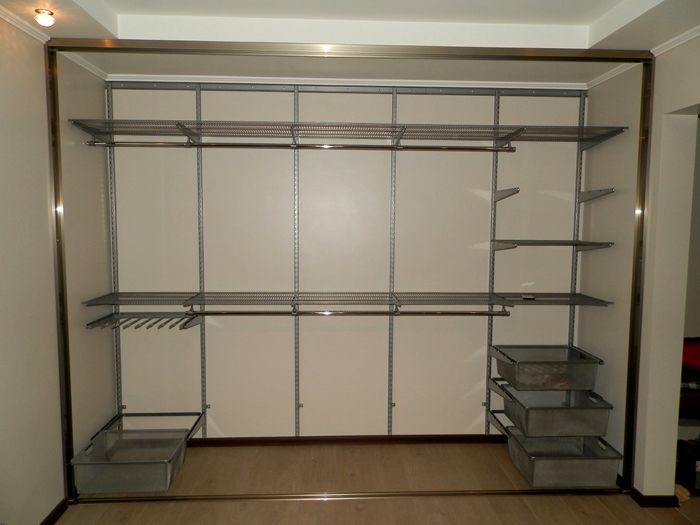 În acest proiect, consolele sunt instalate în șine perforate care sunt atașate direct de peretele clădirii. Această soluție vă permite să schimbați înălțimea rafturilor în timpul funcționării, să adăugați elemente noi. Cadrul cu ghidaje pentru frunza ușii este instalat exact la capătul dimensiunilor camerei. Absența unei huse, podele și pereți reduce semnificativ costul mobilierului fără a compromite funcționalitatea, aspectul și alți parametri ai consumatorului.