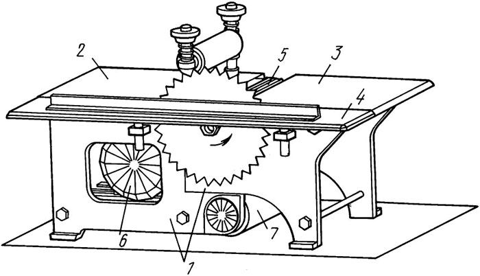 Trei părți ale mesei: 1 - două părți ale unui pat divizat, 2 - masă mobilă, 3 - masă fixă, 4 - masă de ferăstrău, 5 - tambur cu cuțite, 6 - motor electric, 7 - tambur de șlefuit