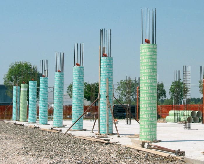 Cofrajele din plastic gata preparate pentru coloane pot fi utilizate pentru a umple fundații de grămadă de beton plictisit sau de moloz