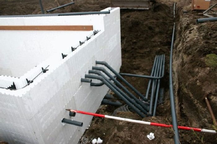 - Locurile de comunicații inginerești sunt marcate. Țevile și ondulațiile cu diametrul corespunzător sunt situate în interiorul gropii. În locurile de ieșire, armătura este introdusă, iar țevile ondulate sunt legate de ea la o înălțime mai mare de 0,5 m de marginea superioară a fundației.